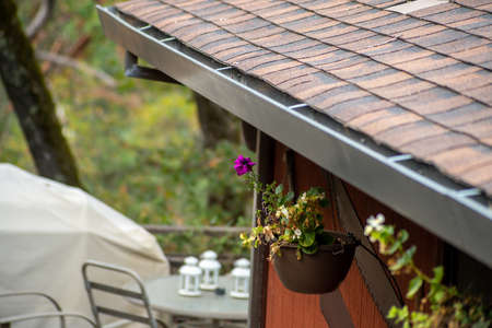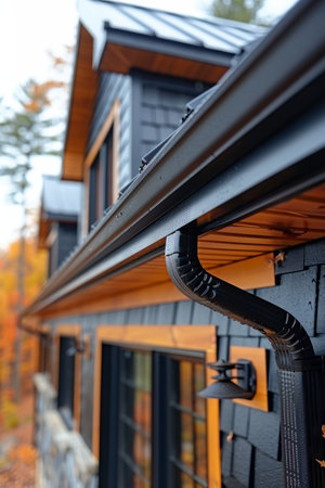 Autumnal view of a gutter system on a cabin surrounded by a forest