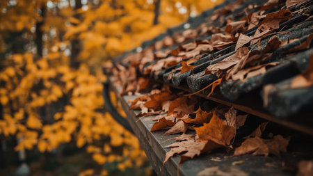 Close-up of dry autumn leaves scattered on a rooftop gutter, with a blurred background of golden foliage, evoking a seasonal and rustic atmosphere.