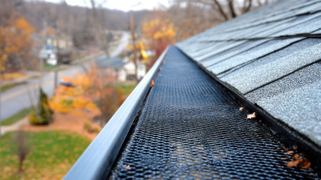 This image presents a close-up perspective of a roof gutter equipped with a protective mesh guard. The composition showcases the gutter's details alongside the roofing shingles. The autumn environment displays a range of colors, and the daylight creates a clear lighting condition. This image is suitable for a variety of editorial or commercial purposes.