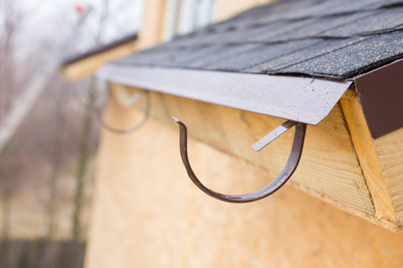 Close up detail of the curved metal bracket for the guttering on a new build timber house