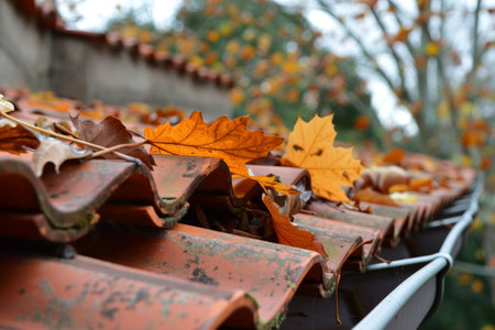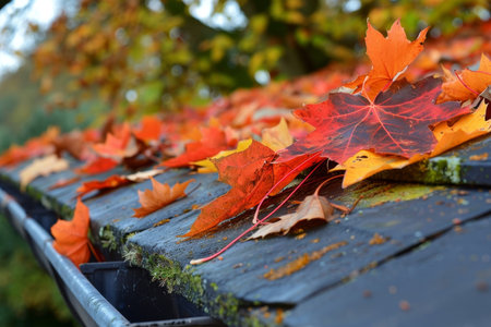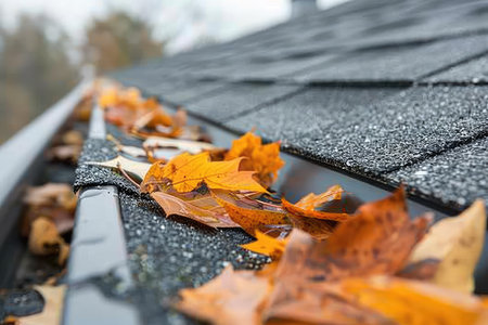 This image showcases a close-up of a gutter overflowing with fallen autumn leaves. The composition highlights the textured roof and the intricate metalwork of the gutter, framed by the blurry backdrop of a house and trees. The warm colors of the leaves contrast with the cool tones of the roof, suggesting an outdoor setting. Suitable for editorial and commercial applications.