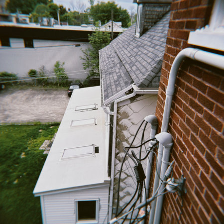 Bottom view of the corner visor of a house with storm drain and blue sky.