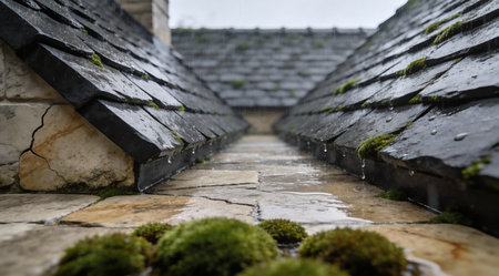 A creative digital illustration depicting Elegant commercial digital art of slate roof tile overlapping texture, aged luxury stone, rainy day diffused light, architectural poise, mossy dark grays with shingle depth, inviting layout. This AI-generated artwork features unique visual elements suitable for various commercial and editorial applications. AI-generated illustration.