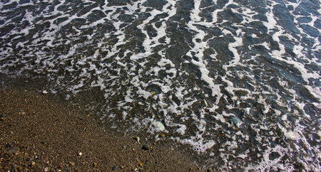 Landscape of a beach shore with waves and foam