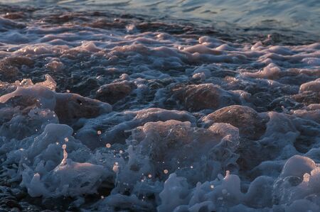 Foam from the sea water on the coast of the beach at sunset day