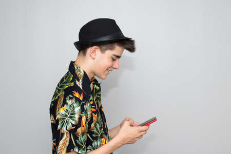 A happy, excited, cheerful man in a black t-shirt, uses a mobile cell phone, writes, surfs, looks at the phone with concern. Young guy isolated on gray studio wall background