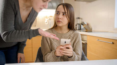 Teenage girl crying after mother shouting at her and taking away smartphone. Gadget addiction and family conflict