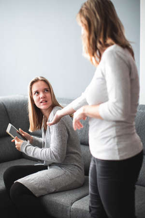 Screen time fight - teenage daughter unhappy about her mother limiting her screen time on a tablet computer