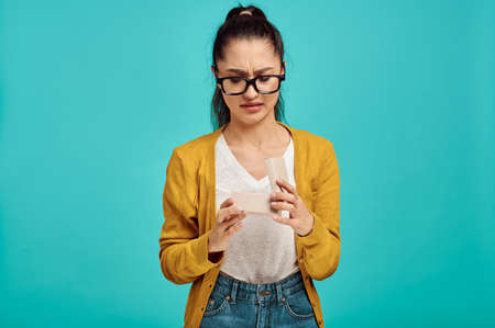 Angry sad caucasian woman holding smartphone having problem with phone on pink background. Mock up copy space