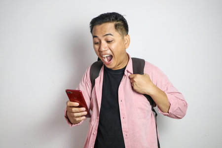 Wow and shocked face of Asian man while looking at his cellular phone. Isolated on white background