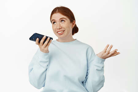 Image of redhead caucasian girl record voice message, talking on speakerphone, gesturing and chatting on mobile app, smiling relaxed, white background