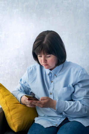 Sad young woman in strict shirt sits on couch with phone in hands. Vertical frame.