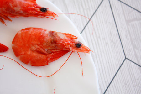 Red shrimp on a white plate and beige background. Minimalistic concept with seafood