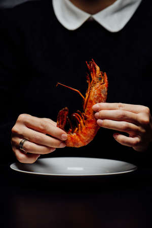 Closeup macro shot in Shallow dept of field of a Shripm in the restaurant. Ai Generative image