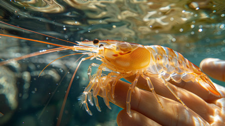 Detailed Close Up of a Vibrant Shrimp Held in a Hand Under Water Highlighting Its Colors and Textures at a Serene Underwater Location During Daylight. Generative AI
