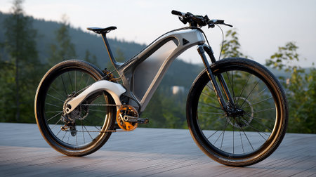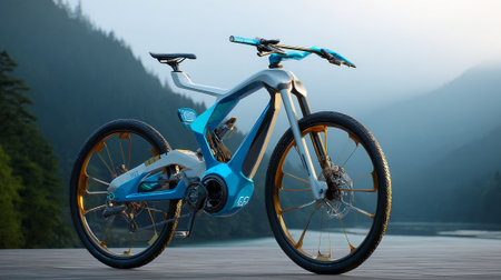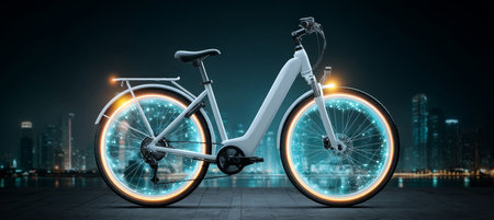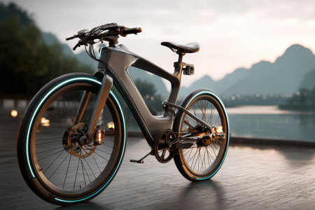 Futuristic electric bike with led lights at scenic lakeside sunset.