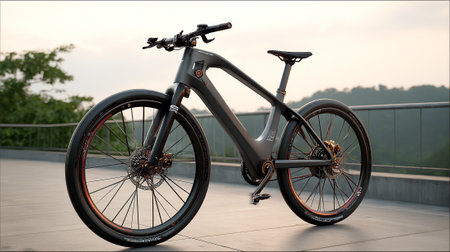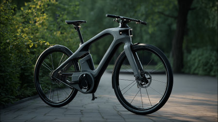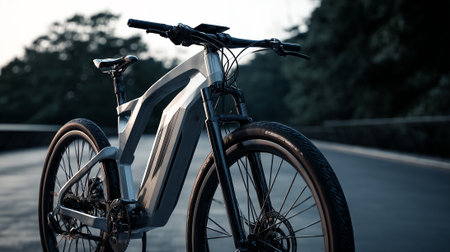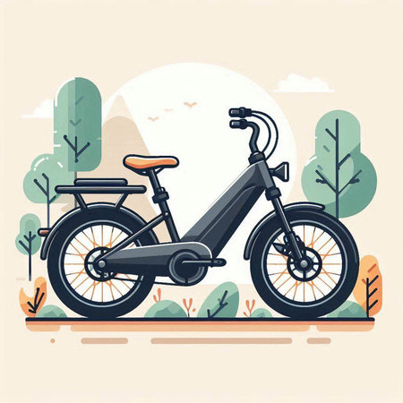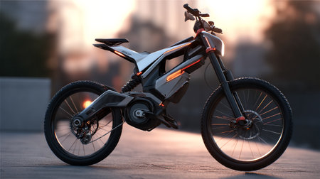 Black and gray electric bicycle in sunrise morning time on frosty field with yellow sun