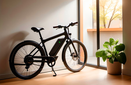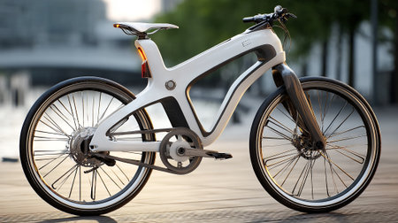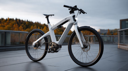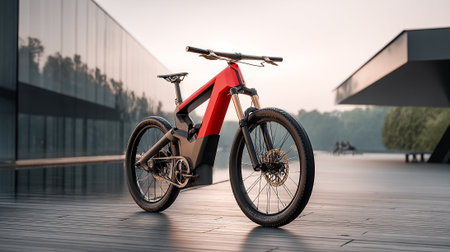 A solar-powered bicycle is parked on a stylish wooden walkway amidst modern architecture in bright daylight.