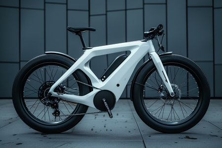 Rental electric bike parked near business office center in downtown Poland. E-bike Bicycle sharing service in urban environment. E-Scooter rent electric scooter company service. Ecological mobility solution Glass passage