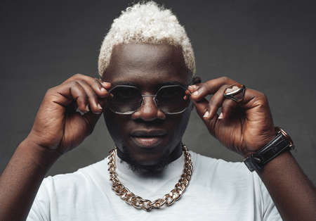 Stylish african guy with white hairs against dark background
