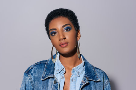 Portrait of modern and confident young african american woman with bold makeup and golden earrings wearing denim outfit and looking at camera on grey background, denim fashion concept