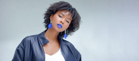 Confident African American woman with curly hair and blue lipstick poses in modern outfit, highlighting vibrant fashion and self-expression in a minimalistic environment