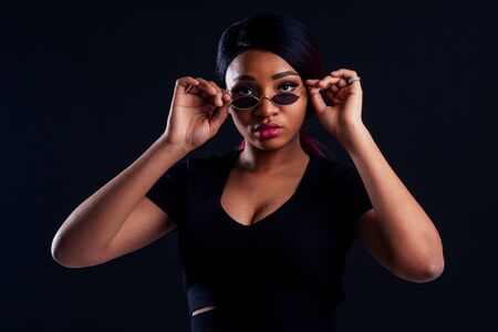 Portrait of young beautiful african girl looking at camera over dark background.
