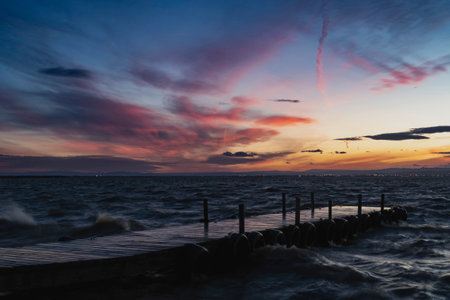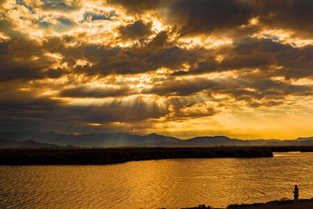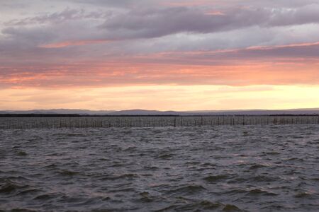Sunset at the mouth of the Ebro Delta and wetlands, Tarragona, Catalonia, Spain.