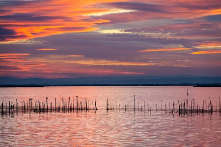 Silhouette of birds standing on poles at dusk in the Albufera in Valencia, a freshwater lagoon and estuary in Eastern Spain.