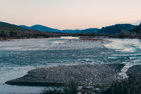 A river through the mountainous area under the sunset sky in autumn