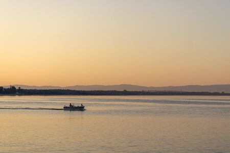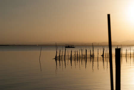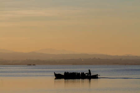 Traditional boat from the Albufera lake of Valencia in Spain transports tourists to observe the beauty of the sunset at the golden hour