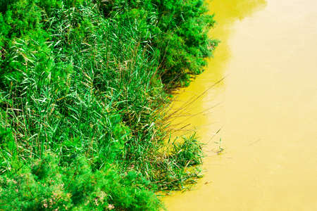 green bushes growing along the river bank. High quality photo