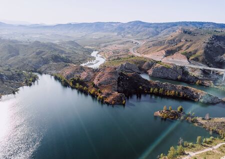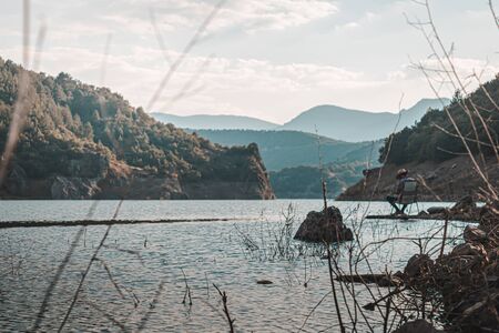 Mountain lake in Spain early in the morning. Spanish landscape at sunrise, hills, water, beach and sunlight