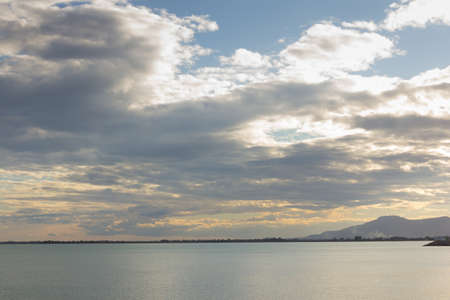 Sea coast of Croatia. Sea and sky with clouds. Calm water. Evening and sunset sun.