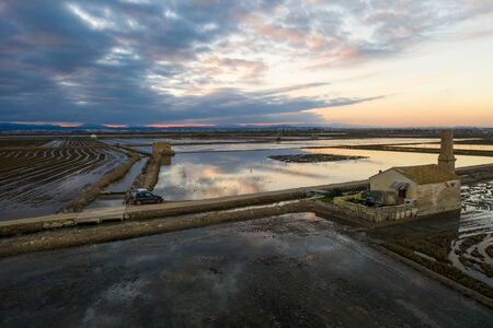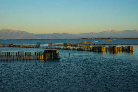 Sun goes down on the lagoon of Grado in a spring day