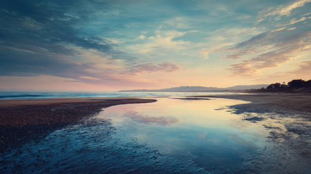 A tranquil beach scene captured at dusk, showcasing calm waters reflecting a colorful sky. This serene landscape invites relaxation and contemplation amidst nature's beauty.