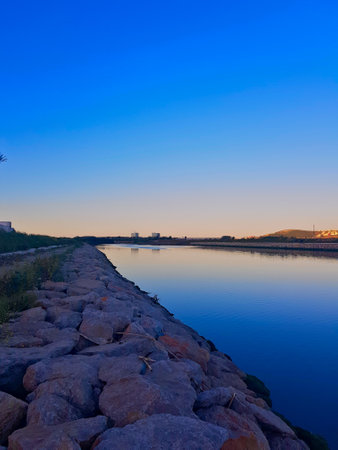 Ebro river valley in Tortosa, Catalonia, Spain sunset, at dusk on summer day