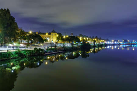 Guadalquivir river of Seville, night scene with lights in the city and reflections in the calm water, panoramic cityscape. Andalusia, Spain,