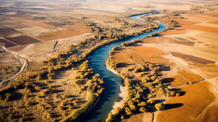 Panoramic view of a river valley in autumn. The yellow tone is observed in the vegetation it makes contrast with the river and the mountains behind. General Roca, RÃo Negro - Patagonia Argentina