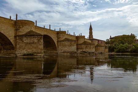 stone historic bridge over the Ebro river in Zaragoza spain