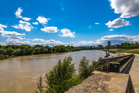 beautiful summer landscape on a sunny day view of the Ebro river and bridges in Zaragoza, Spain
