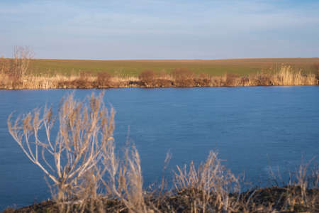 Countryside landscape, blue sky, trees and a lake. autumn landscape.