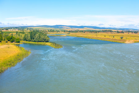 Beautiful summer landscape with river and blue sky in Belarus, Gomel, Soz river.
