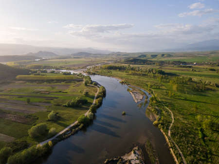 Aerial Sunset view of Struma river passing near village of Topolnitsa, Blagoevgrad region, Bulgaria