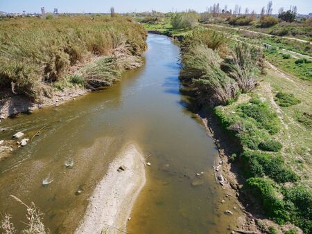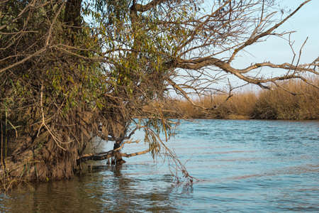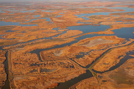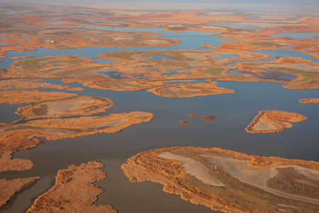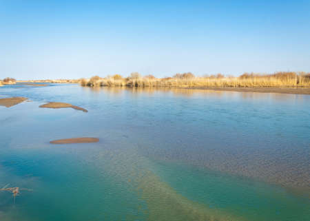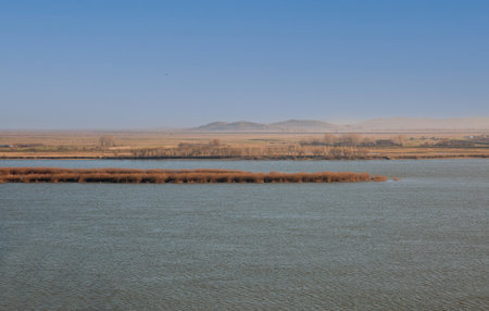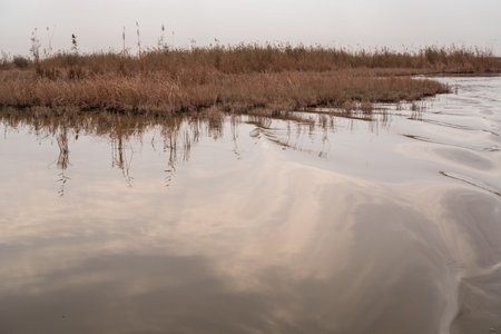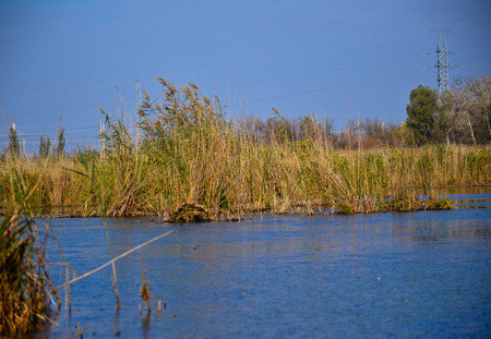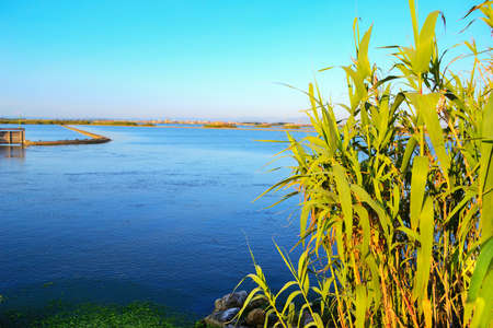 Ebro Delta estuary and wetlands, Tarragona, Catalunya, Spain. Copy space for text