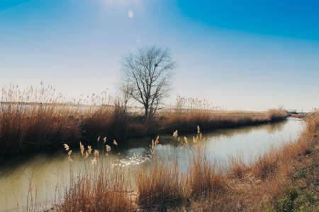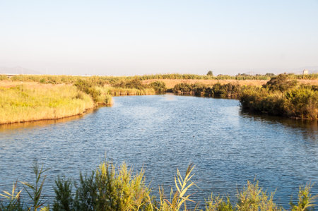 Flooded fields and ditches in the natural park of Albufera, Valencia, Spain. The sunrise sun in which the wild herbs growing in the surroundings of the wetlands paint a golden color