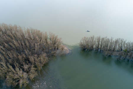 Top aerial view of dry and bare trees and dry grass on the banks of the river in autumn. A small boat is floating on the water. Ukraine, Europe