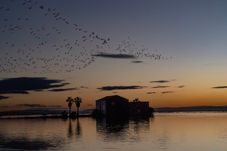 A flock of birds flies over the house on the lake at sunset