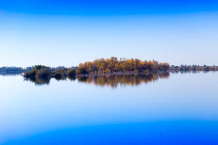 Landscape by the lake with a blue sky, yellow trees on the water with reflection