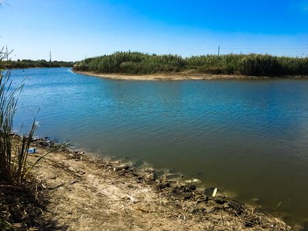 Steppe river reeds summer. views in the view of the river. small blue river by a sunny day